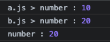 a.js 파일에 number라는 변수를 선언하고 10이라는 값으로 초기화한 후 b.js 파일에서 다시 number 변수를 선언하고 20이라는 값으로 초기화를 하였다. 그 후 index.html 파일에서 두 자바스크립트 파일을 태그를 이용하여 넣고 number 변수를 출력한 결과 20이라는 값으로 출력된 것을 확인할 수 있다. 이는 b.js 파일이 후에 선언되면서 number 변수의 값이 20으로 덮어씌워졌기 때문이다. 만약 a.js 파일이 늦게 선언되게 되면 number 변수의 값은 10이 된다. 하나의 파일 안에 있는 것처럼 동작하는 방식으로 진행되는 것이다.