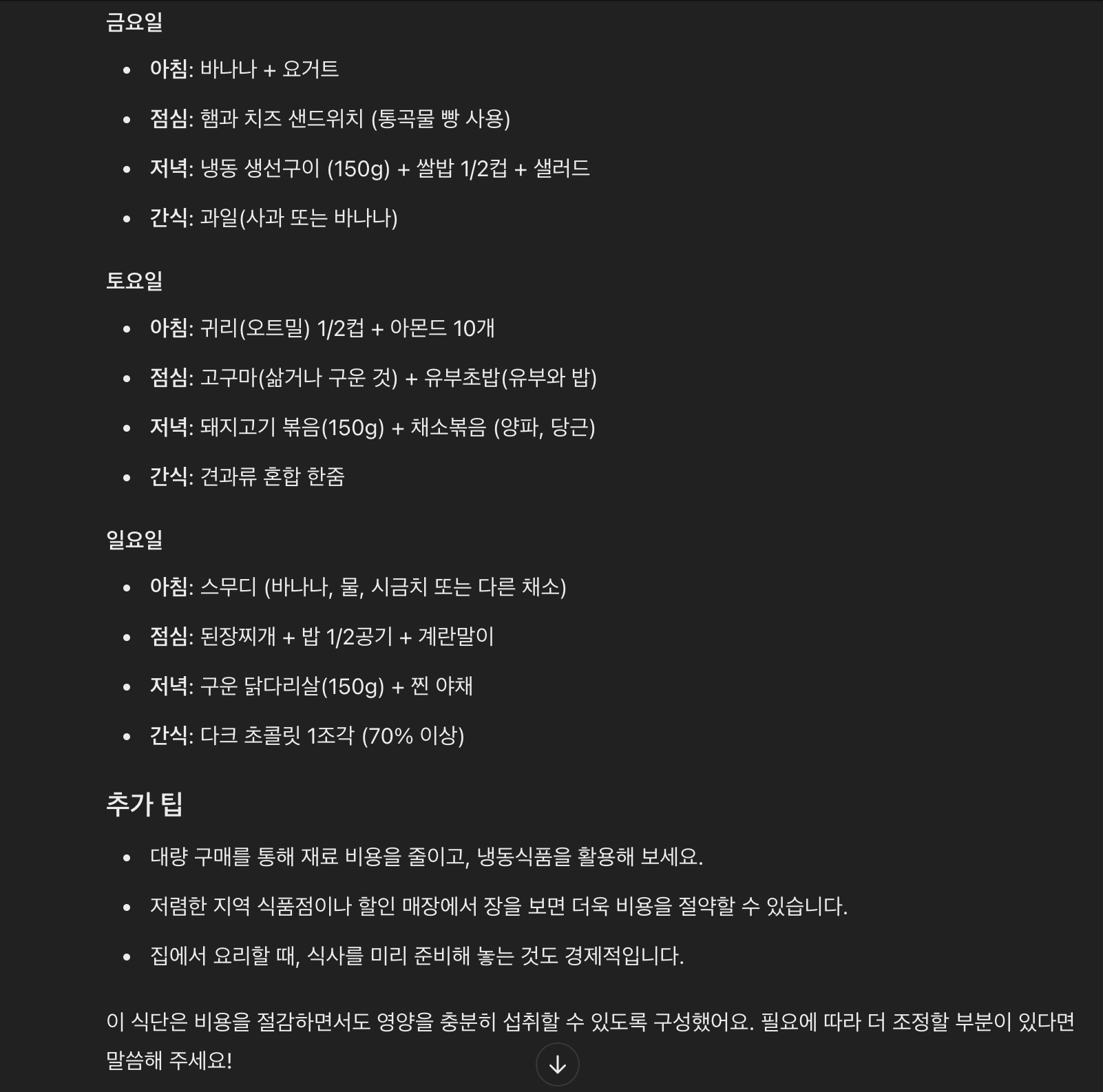 좀 더 저렴한 재료로 할 수 있는 식사 계획을 세워달라고 했다. 그랬더니 새로운 식사계획을 주었다.