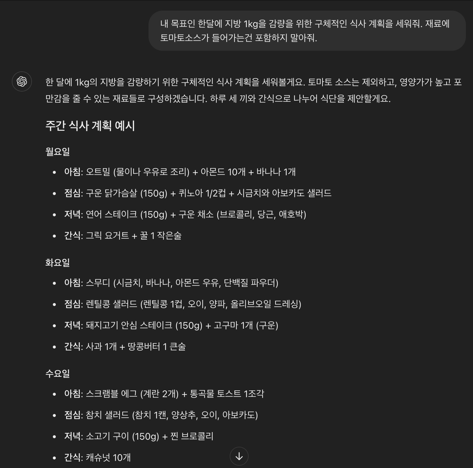 거기에 "너는 지식이 풍부한 영양사야. 나는 30세 여성이야. 키는 160이야. 몸무게는 55kg이야. 일주일에 2번 운동을 해. 한 달에 지방 1kg을 감량하고 싶어. 칼로리 섭취를 줄이는 방법은 싫어." 라는 프롬프트를 넣어주었다.