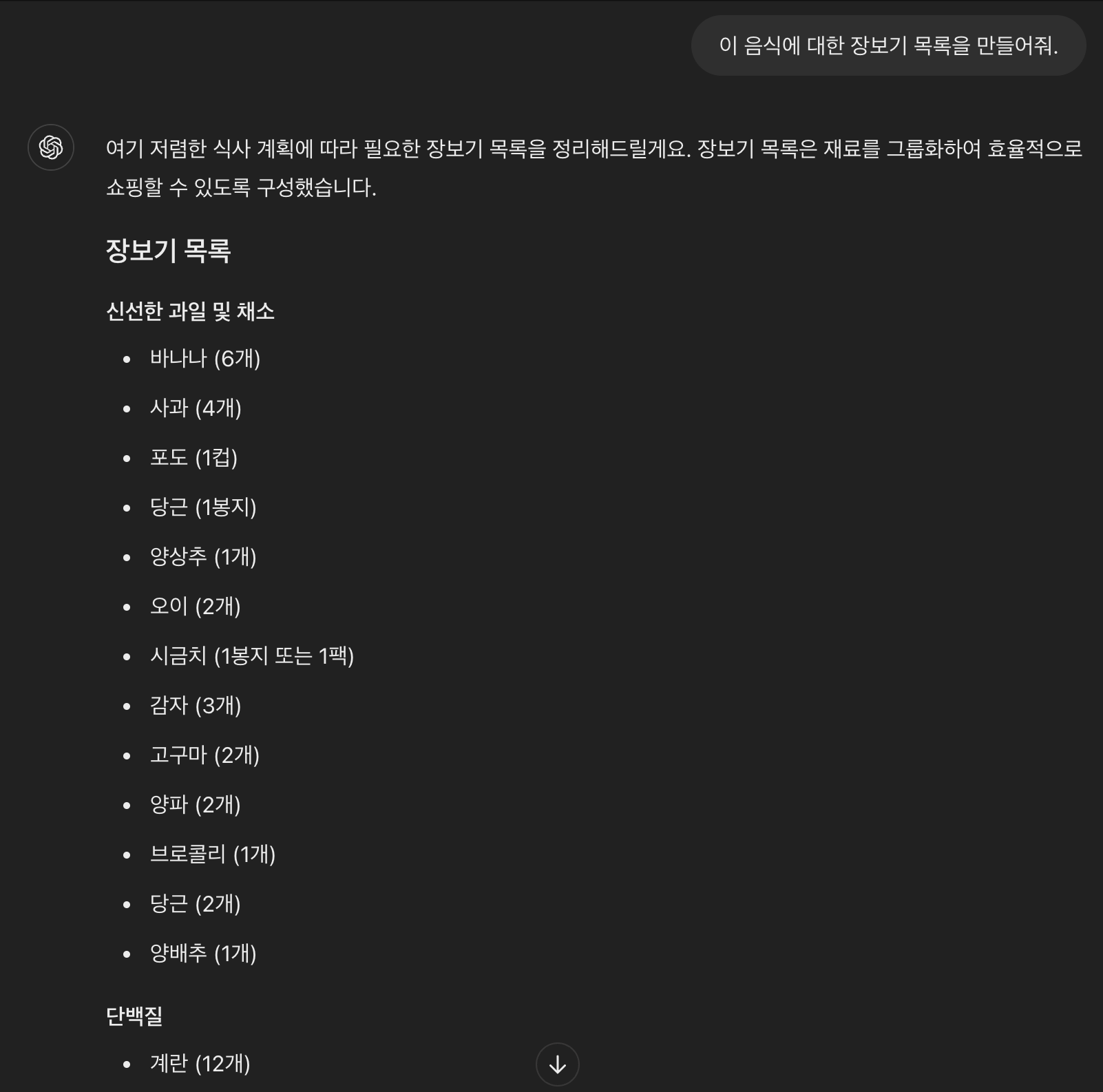 이상으로 오늘은 GPT와 함께 건강을 위한 계획을 세워보았다. 식단표도 짜보고 그 식단에 필요한 장보기 목록도 내놓으라고 해보았다.