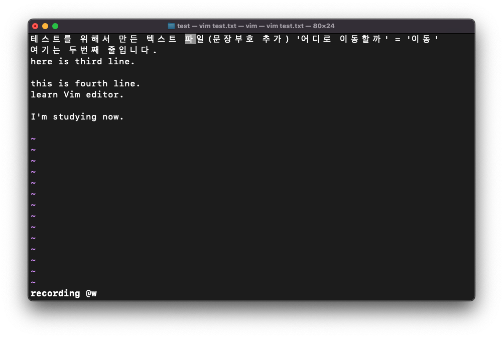 w는 다음 단어나 문장부호의 앞글자로 이동할 수 있다. 위의의 이미지에서 '파'라는 글자에서 w 키를 클릭한 경우 커서는 '(' 문장부호로 이동하게 된다. 그 후 문 -> 추 -> ) -> ' -> 어 -> 이 순서로 커서가 이동한다.