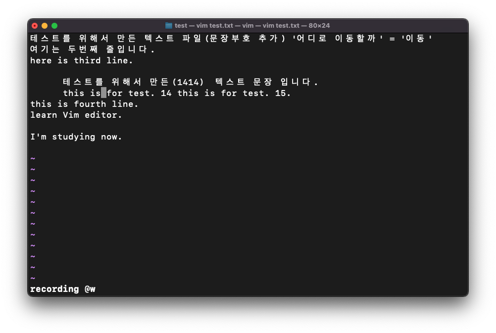 w의 경우 다음 단어나 문장부호의 앞글자로 이동했었다. 그런데 W의 경우에는 조금 다르다. 띄어쓰기 단위로 하나의 단어를 묶는 형태이다. 따라서 위의 이미지에서 '파일(문장부호' 까지가 하나의 단어로 인식되며 다음 단어는 '추가)' 가 된다. 때문에 '파' 에서 W로 커서를 이동할 경우 파 -> 추 -> ' -> 이 순서로 이동이 되는 것을 볼 수 있다.