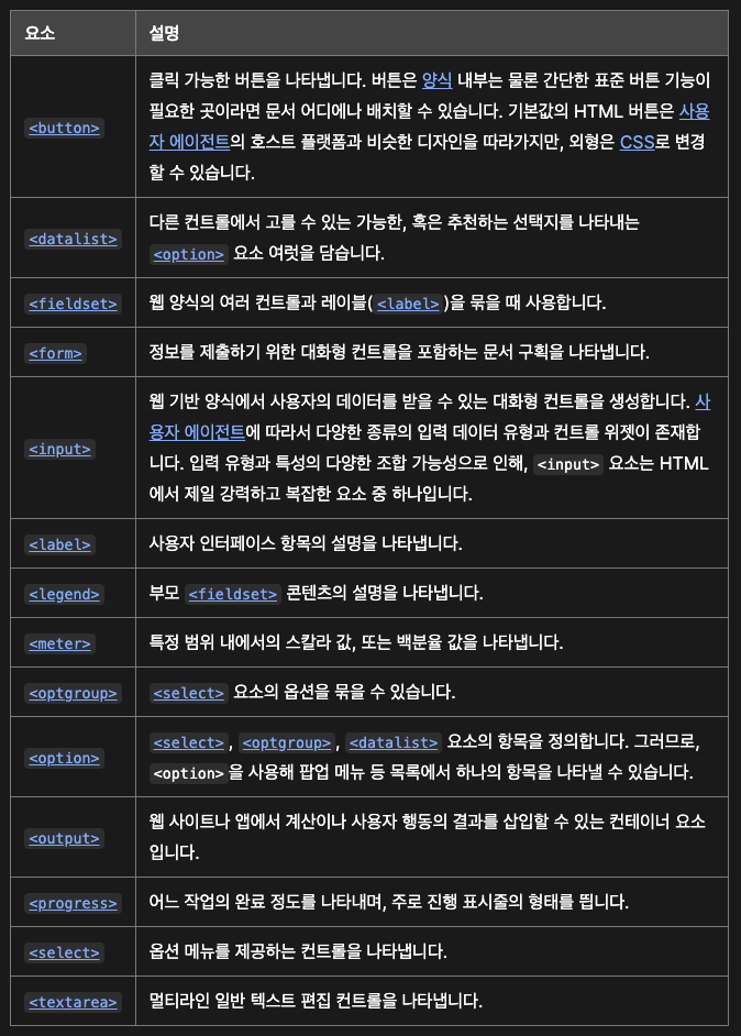 html에서는 여러 입력 가능한 요소들을 제공한다. 아래는 mdn 사이트에서 발췌한 html에서 제공하고있는 입력 요소들이다.